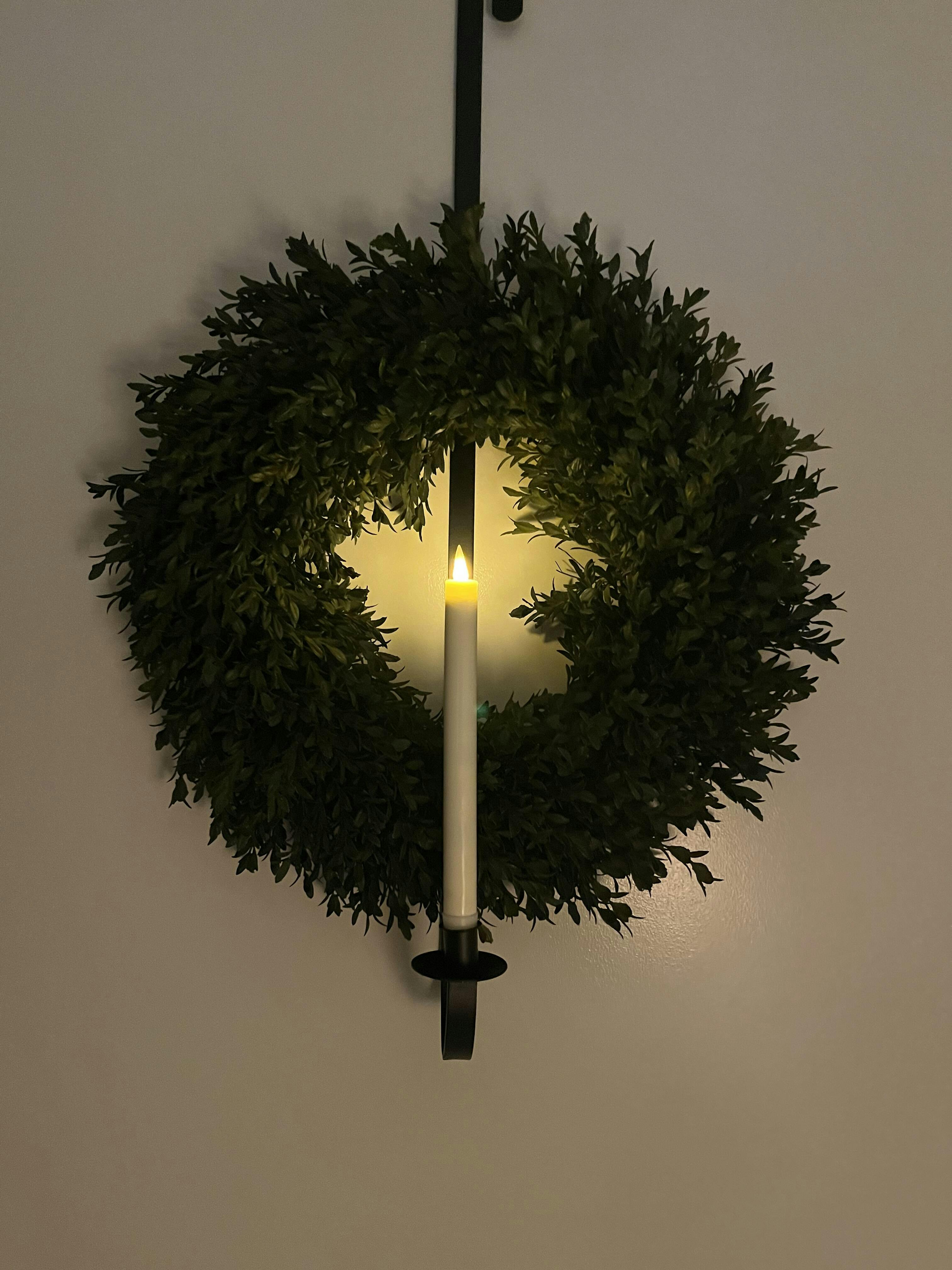 This durable painted iron wreath hanger easily fits over any standard door, adding a touch of elegance to any space. Embrace the nostalgia of candlelight with this classic wreath hanger and candle holder. Simply place a 1" taper LED candle for a warm and inviting glow, for all guests and passerby's to enjoy. Add a seasonal flair by changing the color of the candle as the season progresses for a one of a kind seasonal look.
