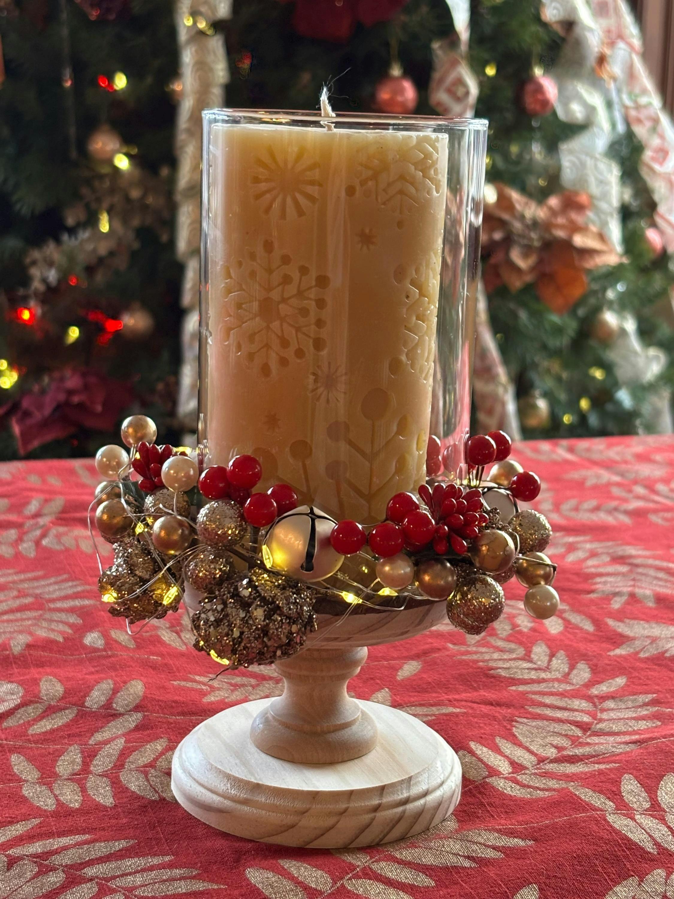 Elevate your holiday décor with this Mini Christmas Glitter Pinecone & Champagne Jingle Bell Candle Ring Centerpiece Mini Wreath. Expertly crafted, it features sparkling pinecones and delicate champagne-colored jingle bells adding a refined festive touch to any table or mantel. Its compact size makes it versatile for intimate settings, while the glitter accents enhance seasonal ambiance with subtle elegance. Perfect for creating a warm, inviting atmosphere during your holiday celebrations.