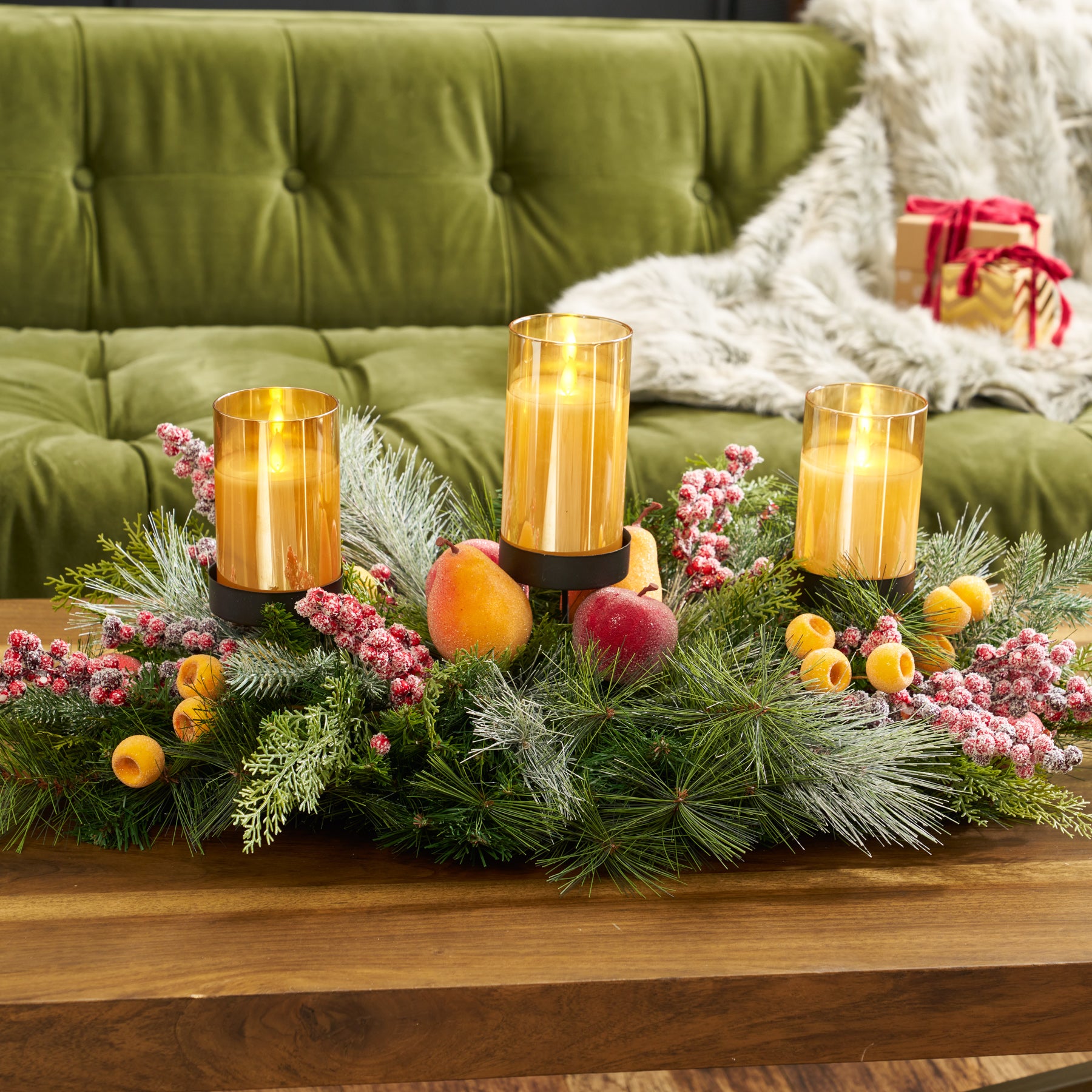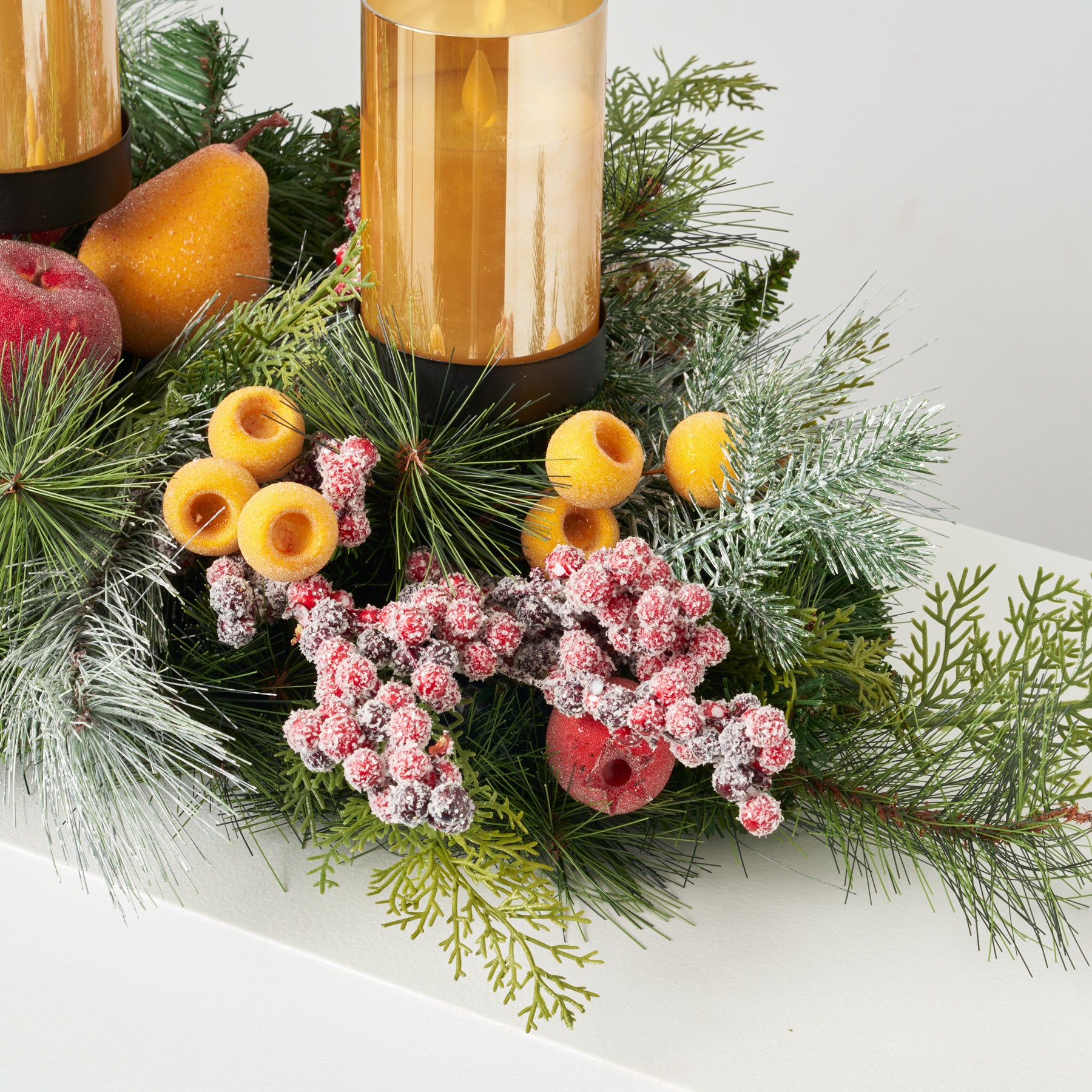 Elevate your holiday décor with this Frosted Fruit 3-Tier Pillar Candle Holder Swag Arrangement. Featuring sugared apples, pears, and crated berries, accented by flocked pine and pinecones, it offers a natural and elegant centerpiece. Designed to complement pillar candles, this table swag brings festive warmth and seasonal charm to your Christmas celebrations with expert craftsmanship and thoughtful detail.