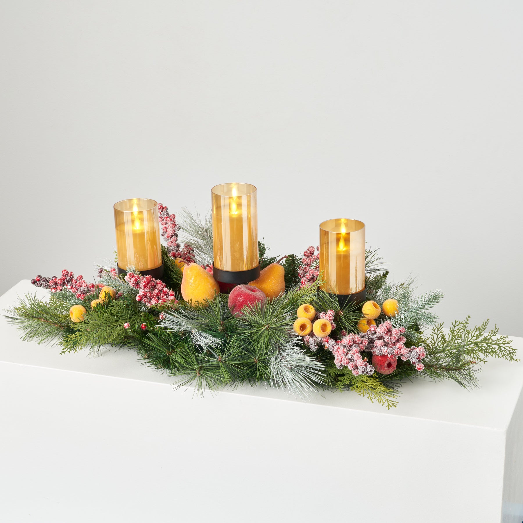Frosted Fruit - Sugared Apple, Pears, Crated Berries with Flocked Pine & Pinecones 3 Tier Pillar Candle Holder Christmas Holiday Table Swag Arrangement