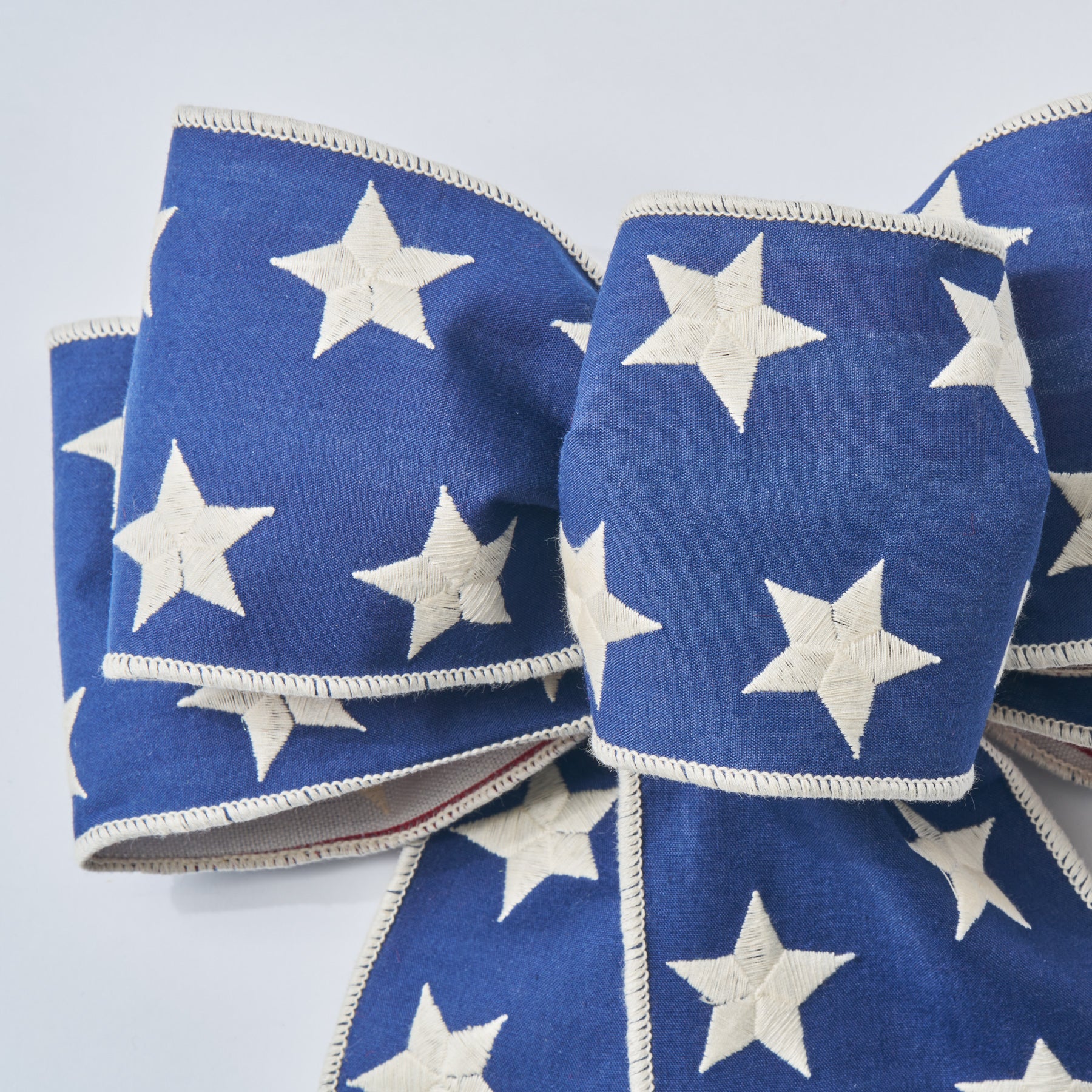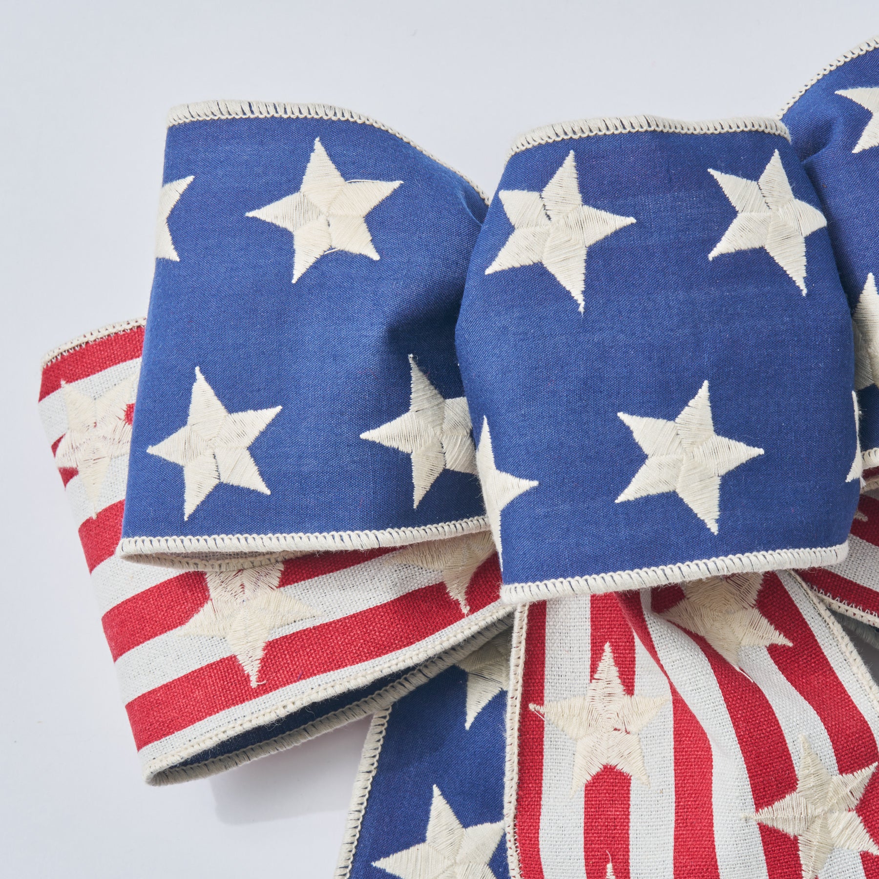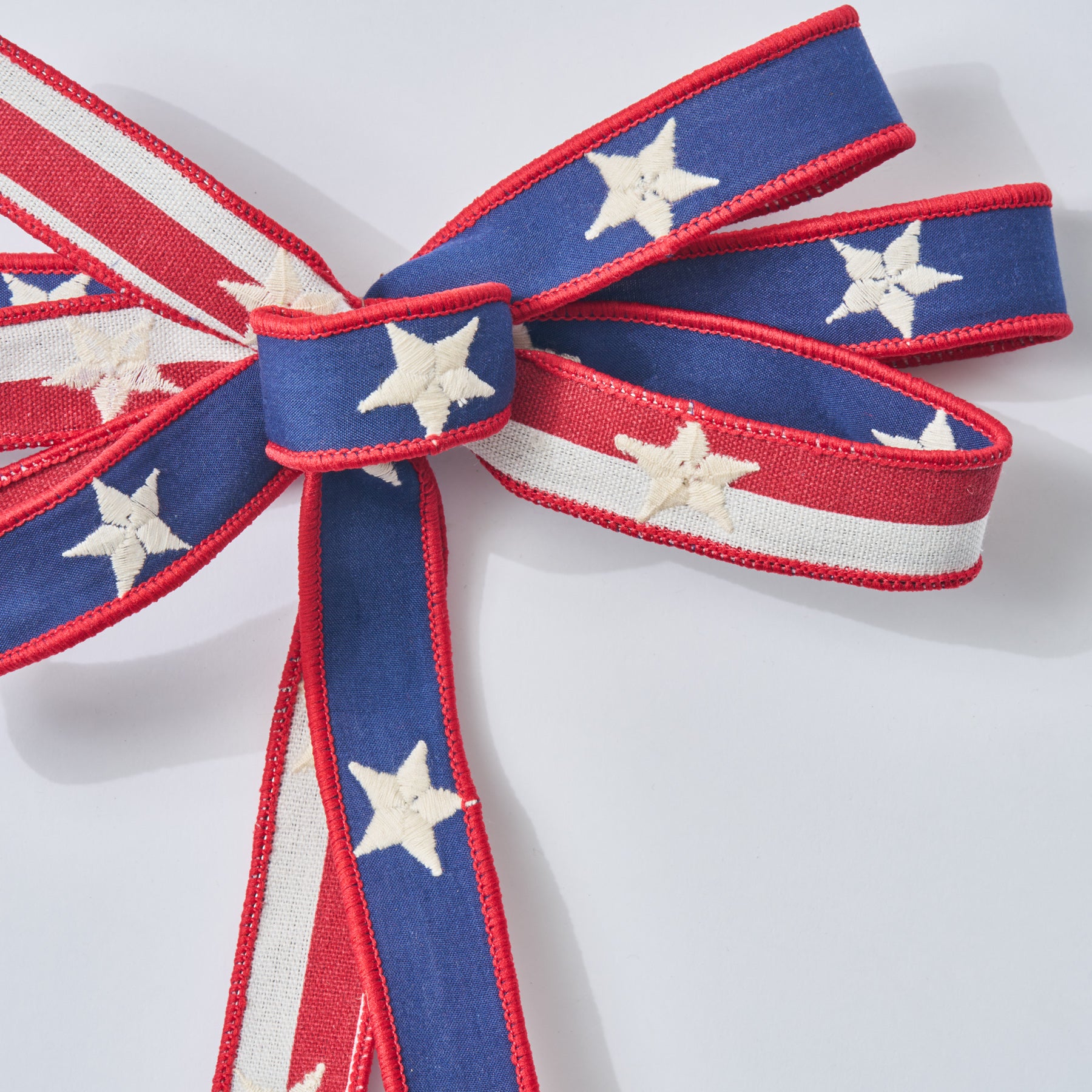 Celebrate American pride with this premium wired ribbon featuring bold embroidered stars and stripes. The reversible design showcases rich red and blue hues on different sides, offering versatile styling options for patriotic décor projects. The sturdy wire-edged construction holds its shape beautifully, making it ideal for wreaths, garlands, gift wrapping, and floral arrangements. Each spool contains five yards of thick, high-quality ribbon that maintains its form through multiple uses. Perfect for Independence Day displays, memorial tributes, or year-round Americana-themed decorating.