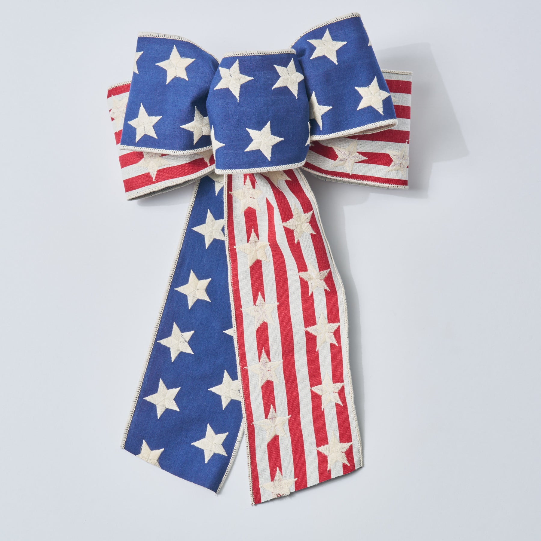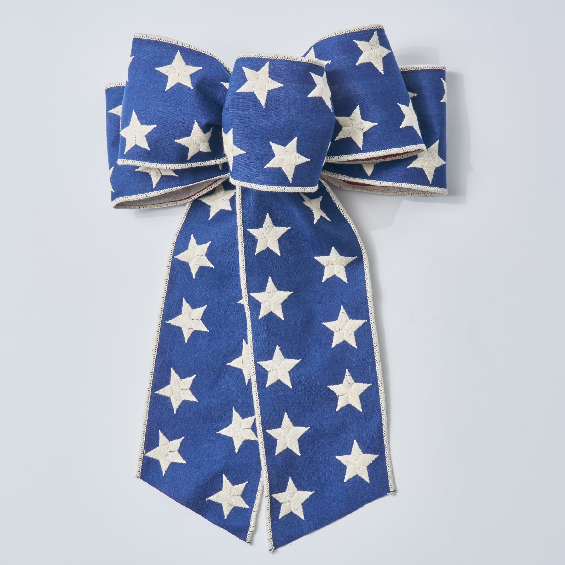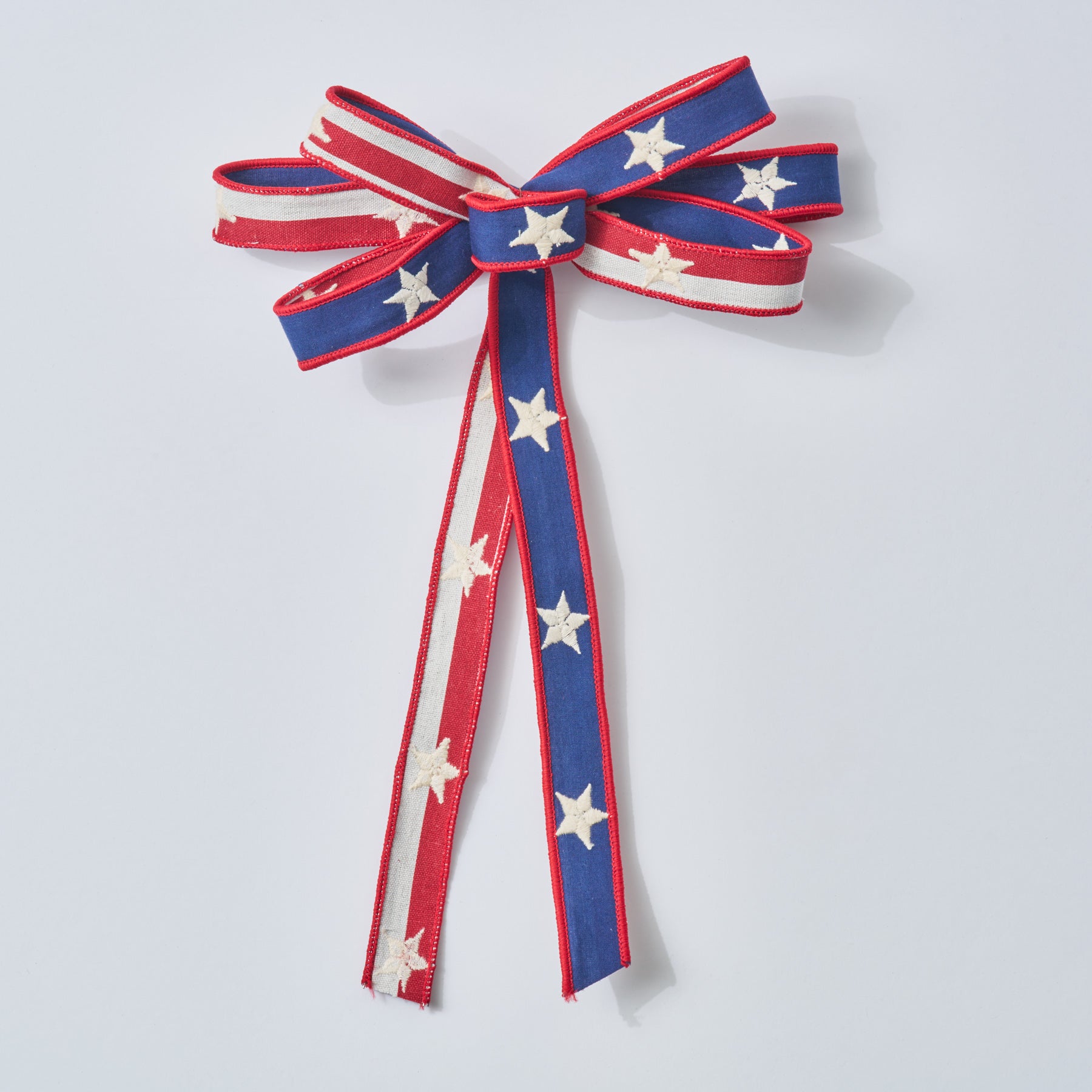 Celebrate American pride with this premium wired ribbon featuring bold embroidered stars and stripes. The reversible design showcases rich red and blue hues on different sides, offering versatile styling options for patriotic décor projects. The sturdy wire-edged construction holds its shape beautifully, making it ideal for wreaths, garlands, gift wrapping, and floral arrangements. Each spool contains five yards of thick, high-quality ribbon that maintains its form through multiple uses. Perfect for Independence Day displays, memorial tributes, or year-round Americana-themed decorating.