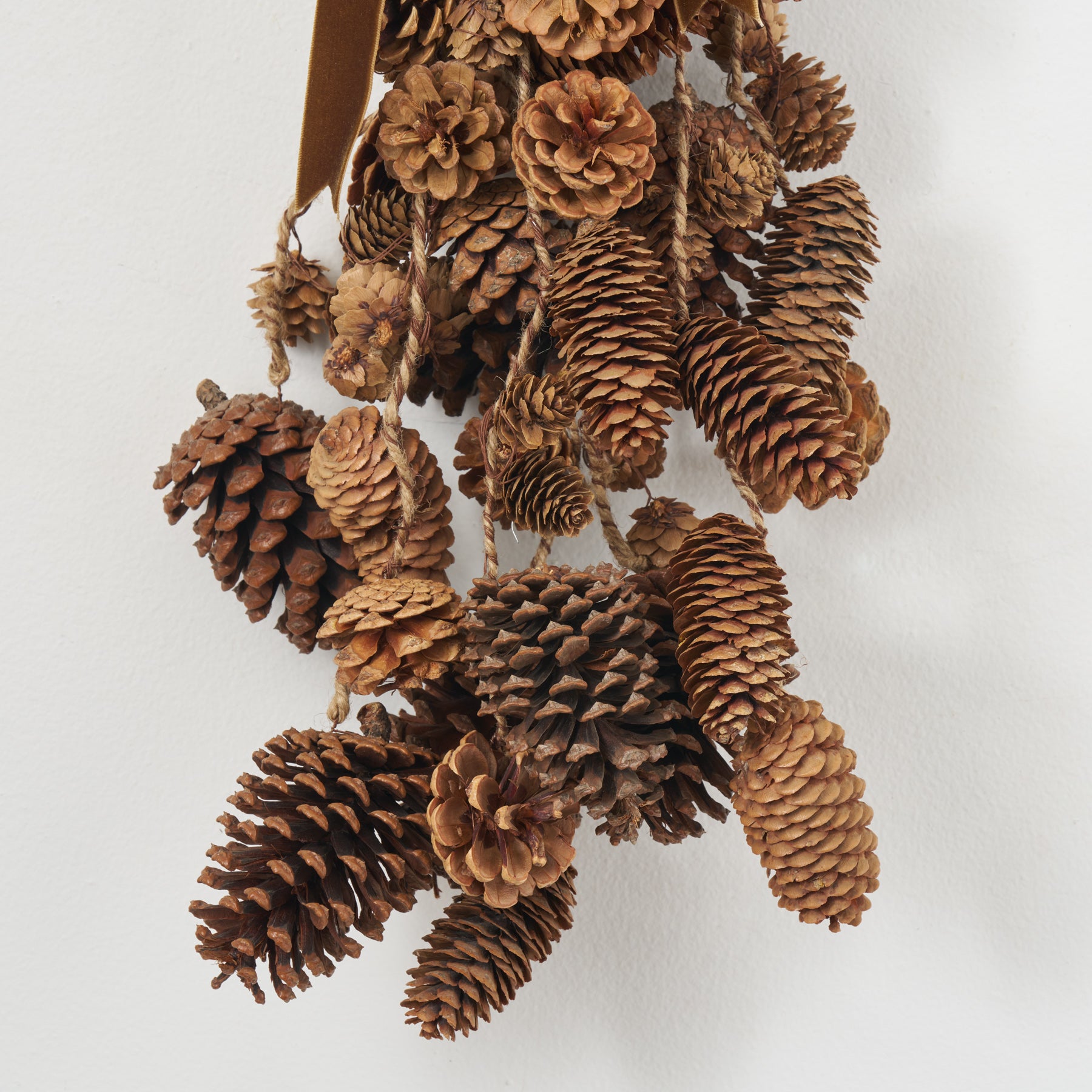Mixed Hanging Pinecones Christmas Decor Swag with Gold Brown Velvet Ribbon
