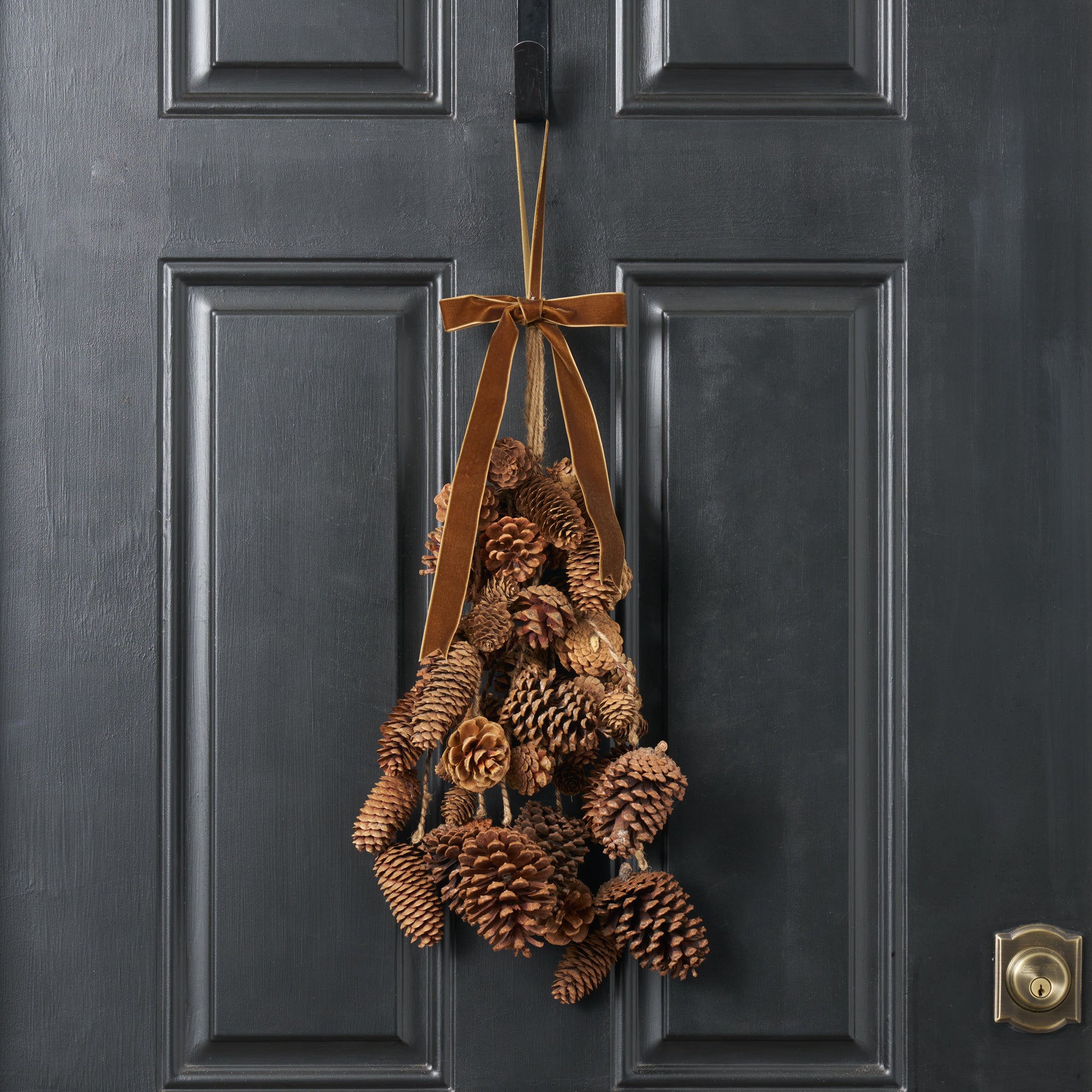 This Mixed Hanging Pinecones Christmas Decor Swag combines natural pinecones in varied shapes and sizes, accented with a rich gold brown velvet ribbon for an elegant finish. Perfect for adding refined texture and warmth, it hangs easily on doors, mantels, or walls to elevate your holiday ambiance with classic, sophisticated style.