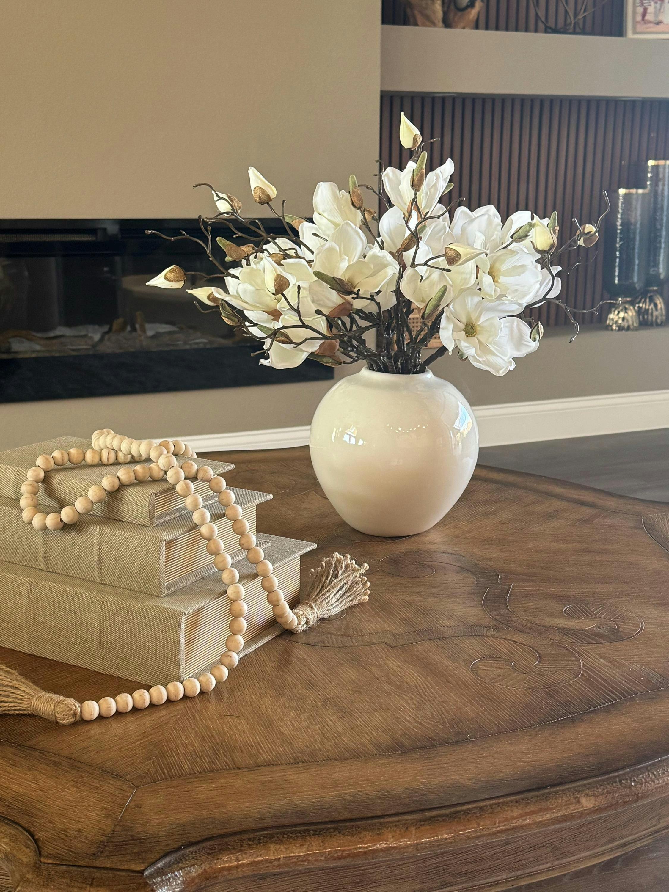 Elevate your space with this Classic White Magnolia arrangement, featuring lifelike blooms and branches artfully designed in a cream gloss ceramic rounded vase. Perfect as an everyday centerpiece, it brings timeless elegance and subtle sophistication to any room while requiring no maintenance. Its refined neutral tones seamlessly complement diverse decor styles, making it an expert choice for lasting beauty and effortless style.