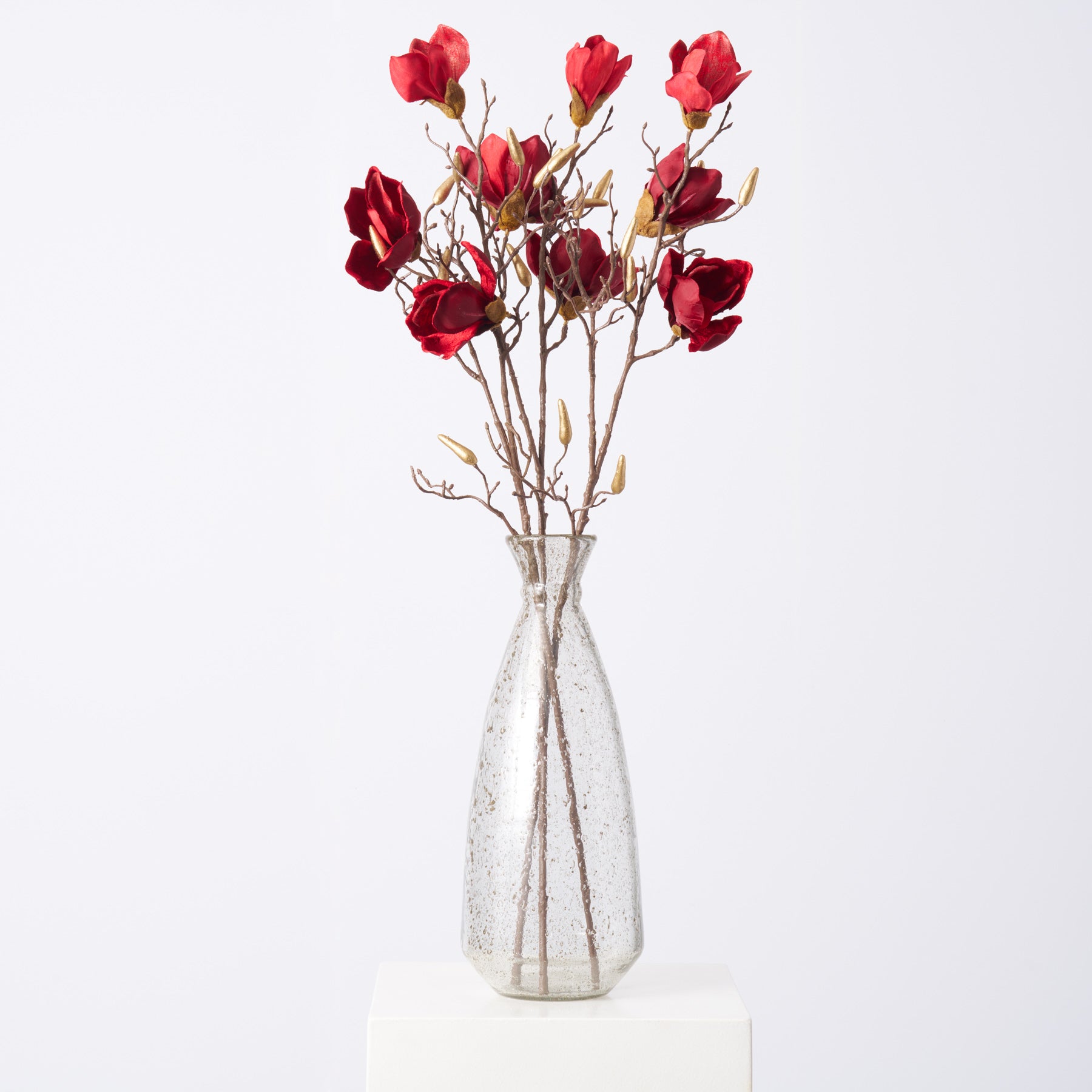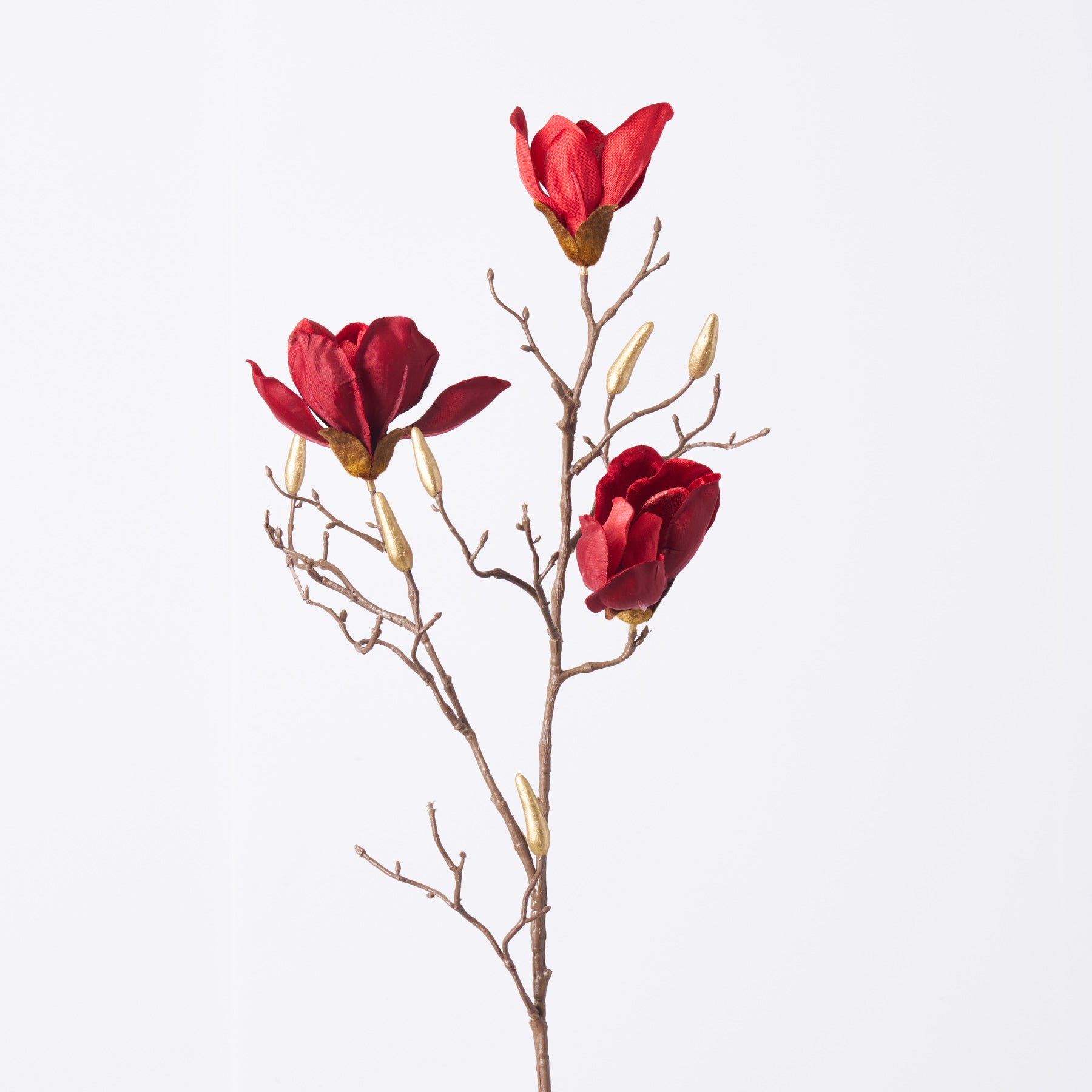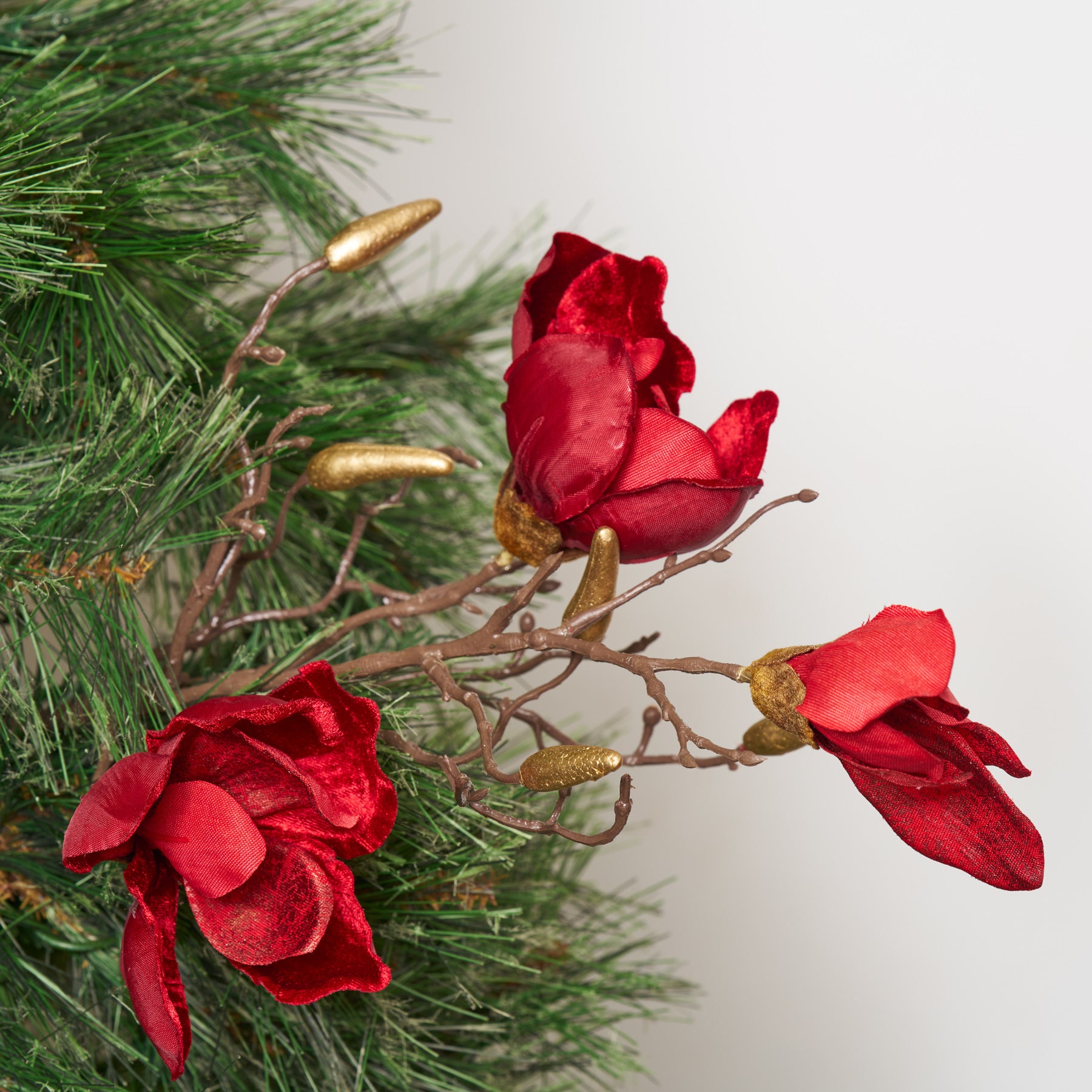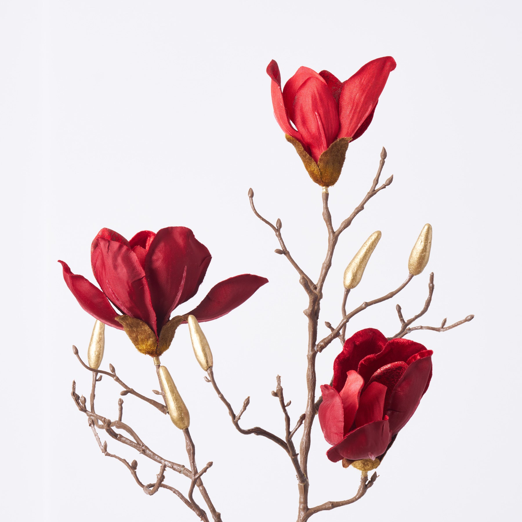Elevate your holiday décor with this 35-inch Red Lux Velvet Magnolia Bloom Christmas floral spray branch. Featuring rich velvet petals and elegant gold-dipped buds, it offers a sophisticated and lasting festive accent. Perfect for wreaths, centerpieces, or mantle arrangements, this faux floral spray brings a touch of luxury without the maintenance of real flowers. Its vibrant color and detailed craftsmanship ensure a striking addition to your seasonal displays year after year.Don't forget to shop our collection of vessels and vases to display your beautiful new flowers in.