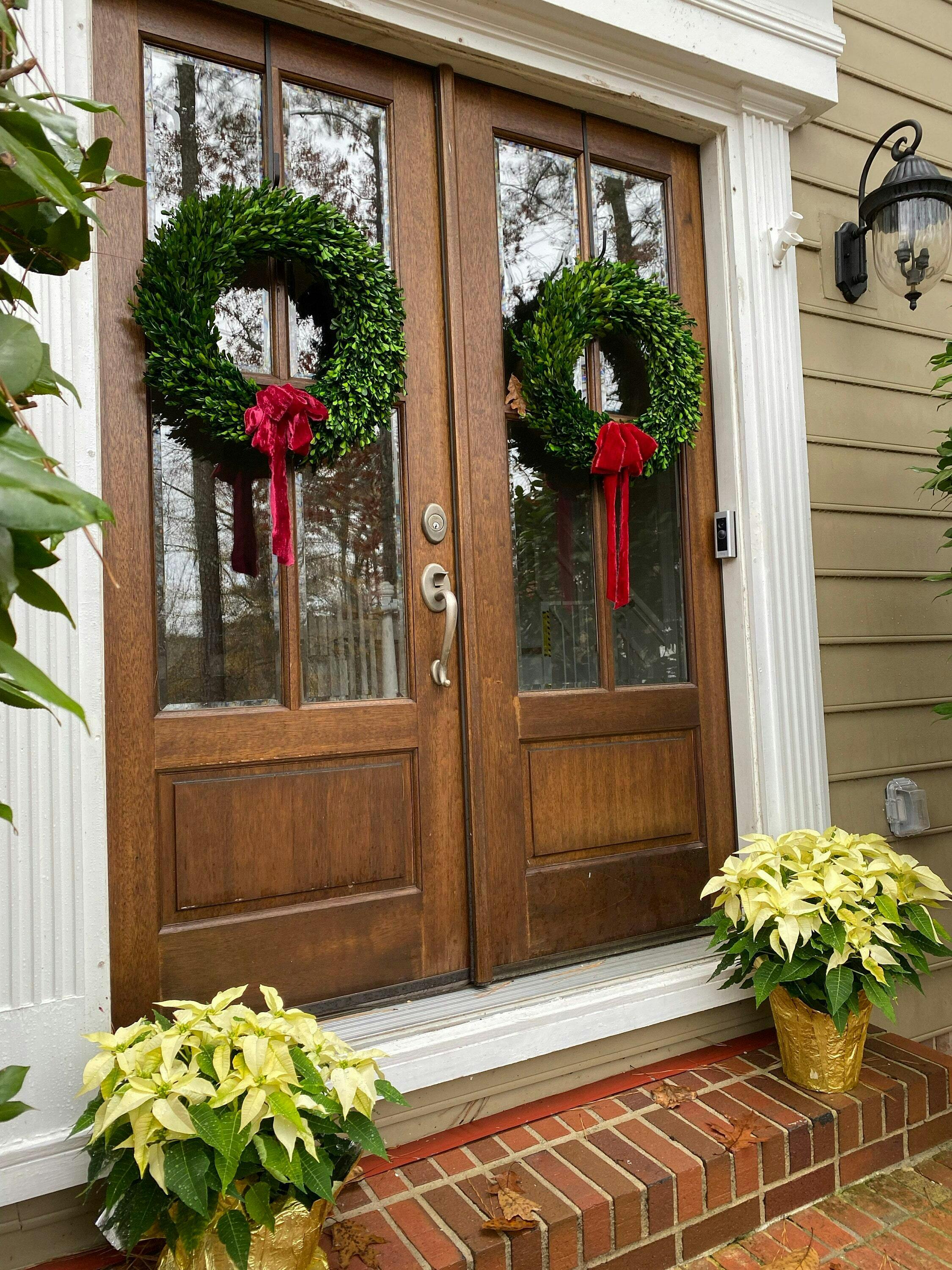 Love the boxwood wreath. Looks elegant, velvet bow is really nice touch.