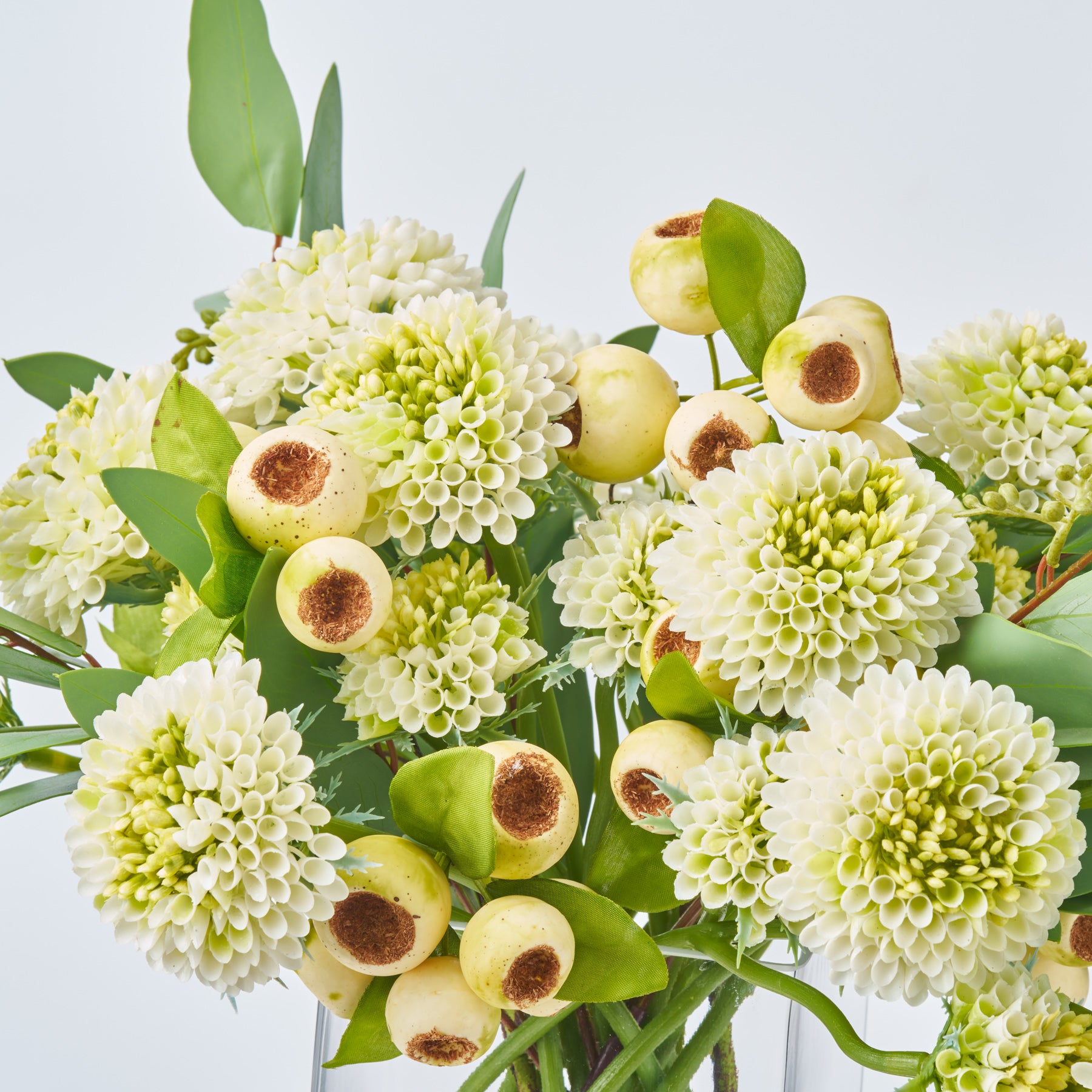 Bring timeless elegance to any room with this stunning hydrangea arrangement. Featuring lifelike limelight green blooms in full, lush clusters, this piece captures the natural beauty of fresh flowers without the maintenance. The sophisticated beveled glass urn vase adds architectural interest with its classic proportions and refined detailing. The water illusion base creates an authentic, just-arranged appearance that complements traditional and contemporary décor alike. Perfect for entryways, dining tables, or living spaces, this arrangement offers year-round color and texture that never wilts or fades.
