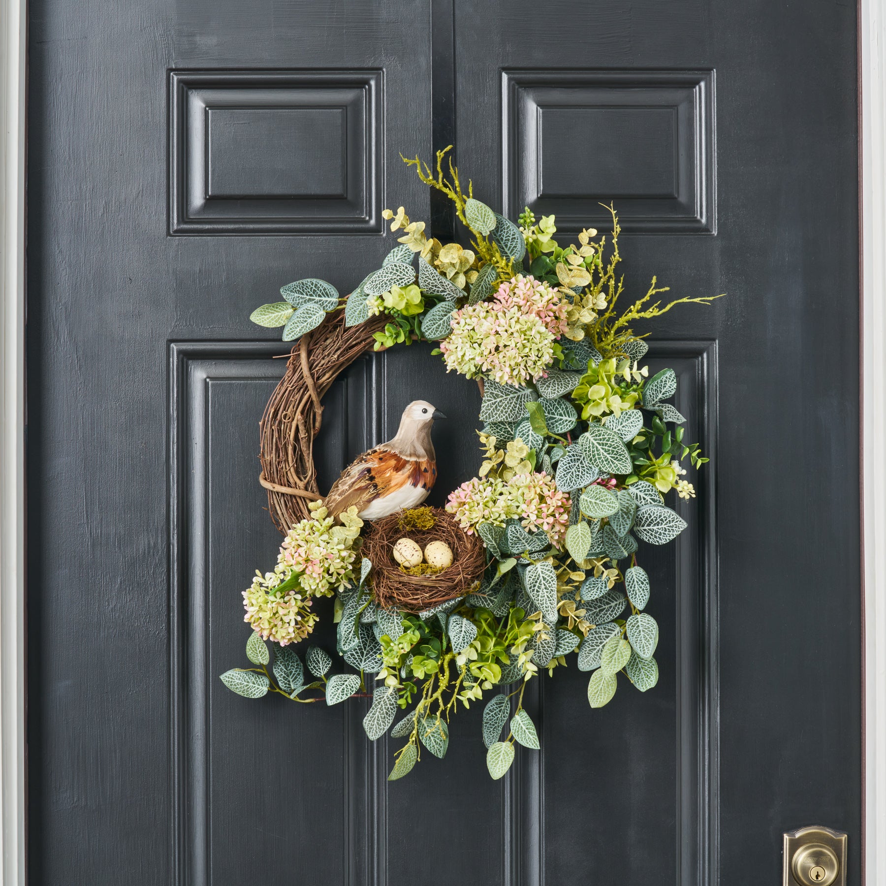 Welcome spring and Easter with this charming front door wreath, expertly crafted to celebrate the season. Featuring a lush salal leaf base adorned with delicate pussy willow branches, dried peonies, and whimsical carrot accents, this wreath brings festive warmth to your entryway. The thoughtful combination of natural elements creates visual interest while maintaining an elegant, garden-inspired aesthetic. Perfect for extending your seasonal décor from Easter through summer, this piece adds character and curb appeal to any home. A sophisticated choice for those seeking authentic, nature-forward design.