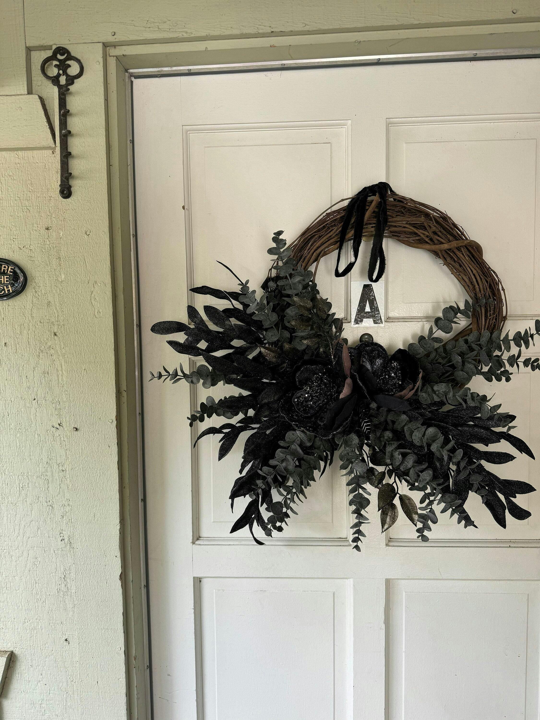 The Macabre Magnolia wreath features black jagged pine, magnolia leaves, mini velvet pumpkins, and a black velvet ribbon arranged asymmetrically for a striking Halloween display. Expertly designed, this front door and mantle wreath combines dark, textured elements to create a sophisticated and eerie ambiance, perfect for elevating your seasonal decor with a refined gothic touch. Our wreaths also make an excellent gift that can be enjoyed for years to come.