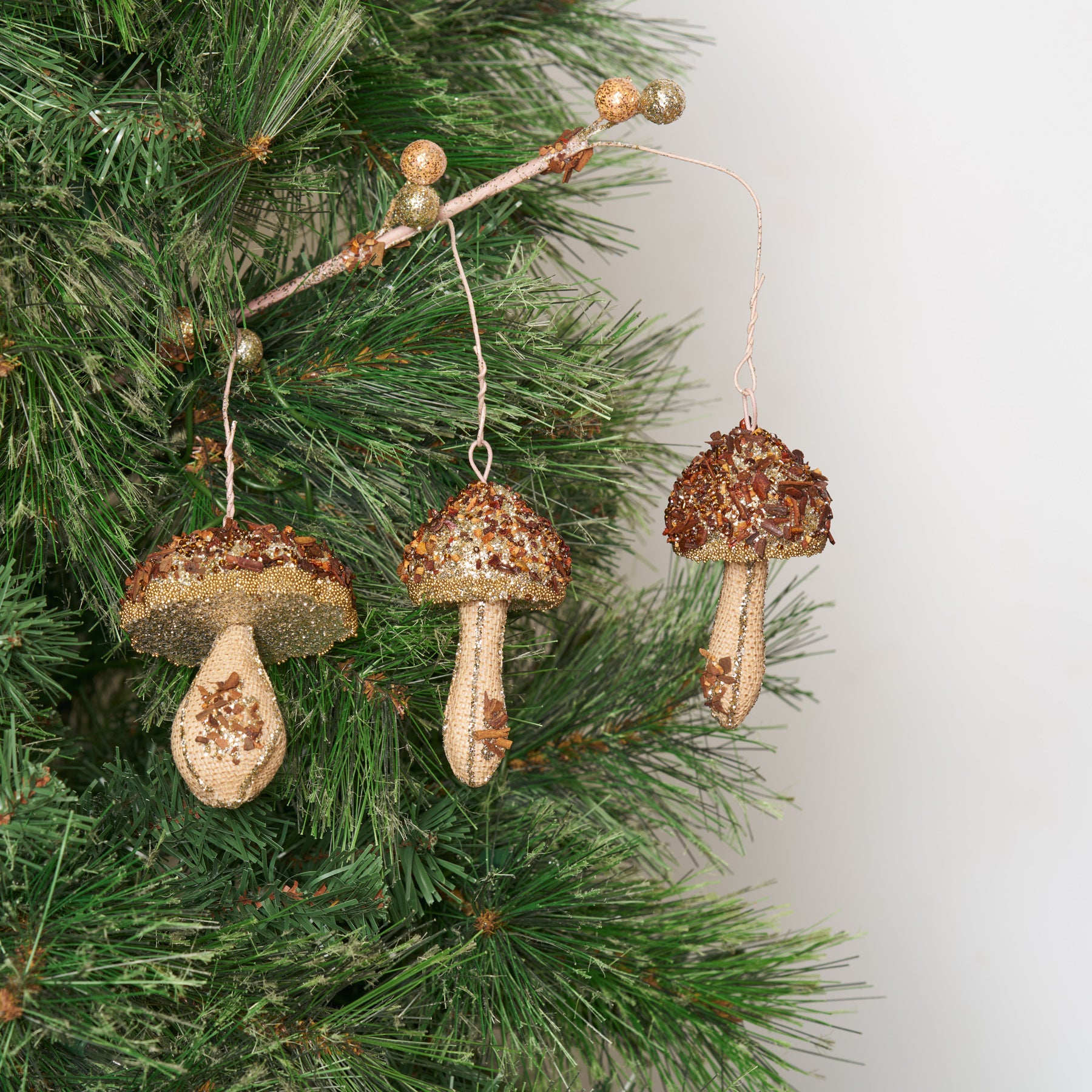 Elevate your holiday decor with our Bronze Gold Glitter & Sequin Adorned Hanging Mushroom Branch Spray - 27". Featuring a stunning combination of bronze gold glitter and sequins, this branch spray will add a touch of elegance and sparkle to your home. Perfect for adorning your Christmas tree or adding a pop of shimmer to any room. Don't forget to shop our collection of vessels and vases to display your beautiful new faux florals in.