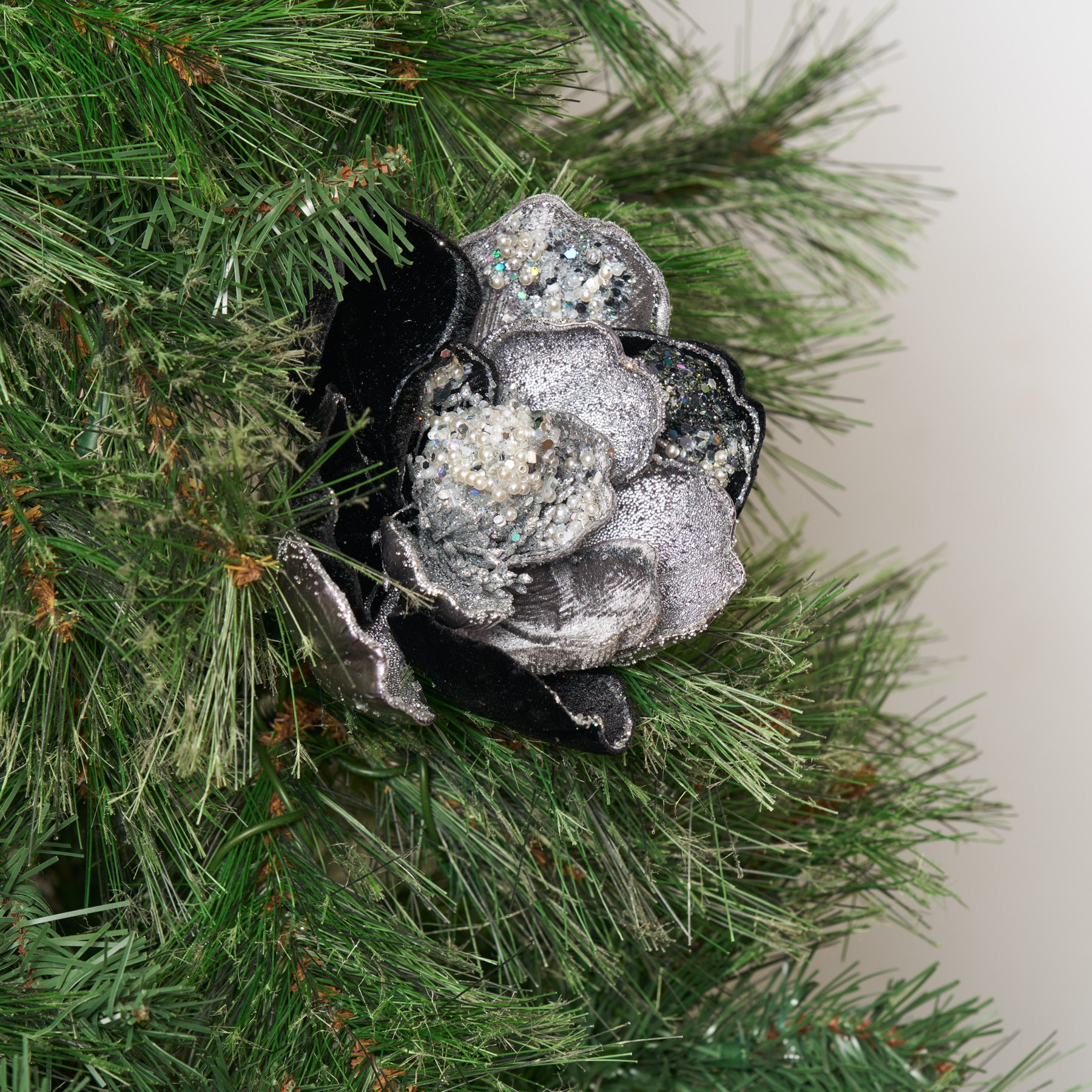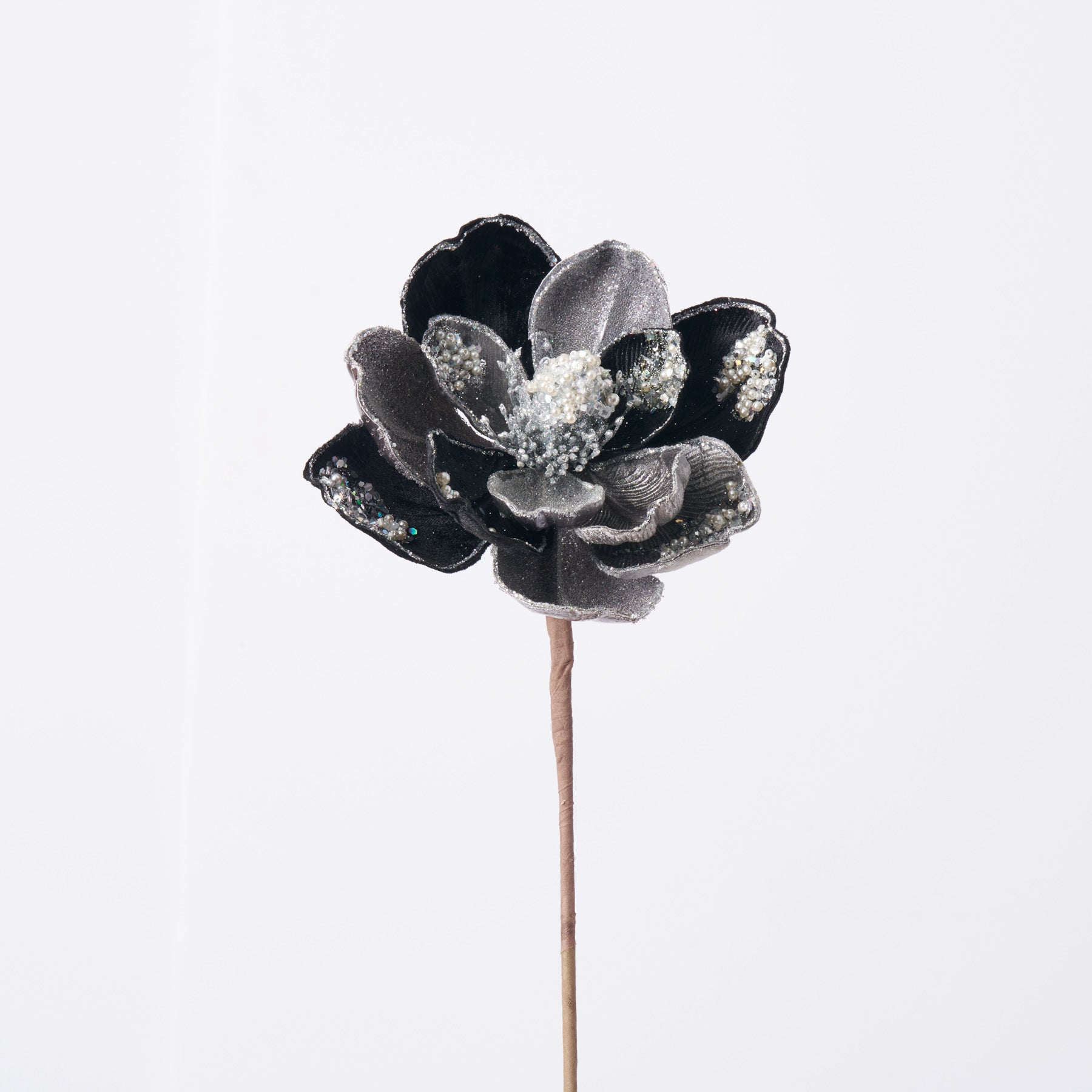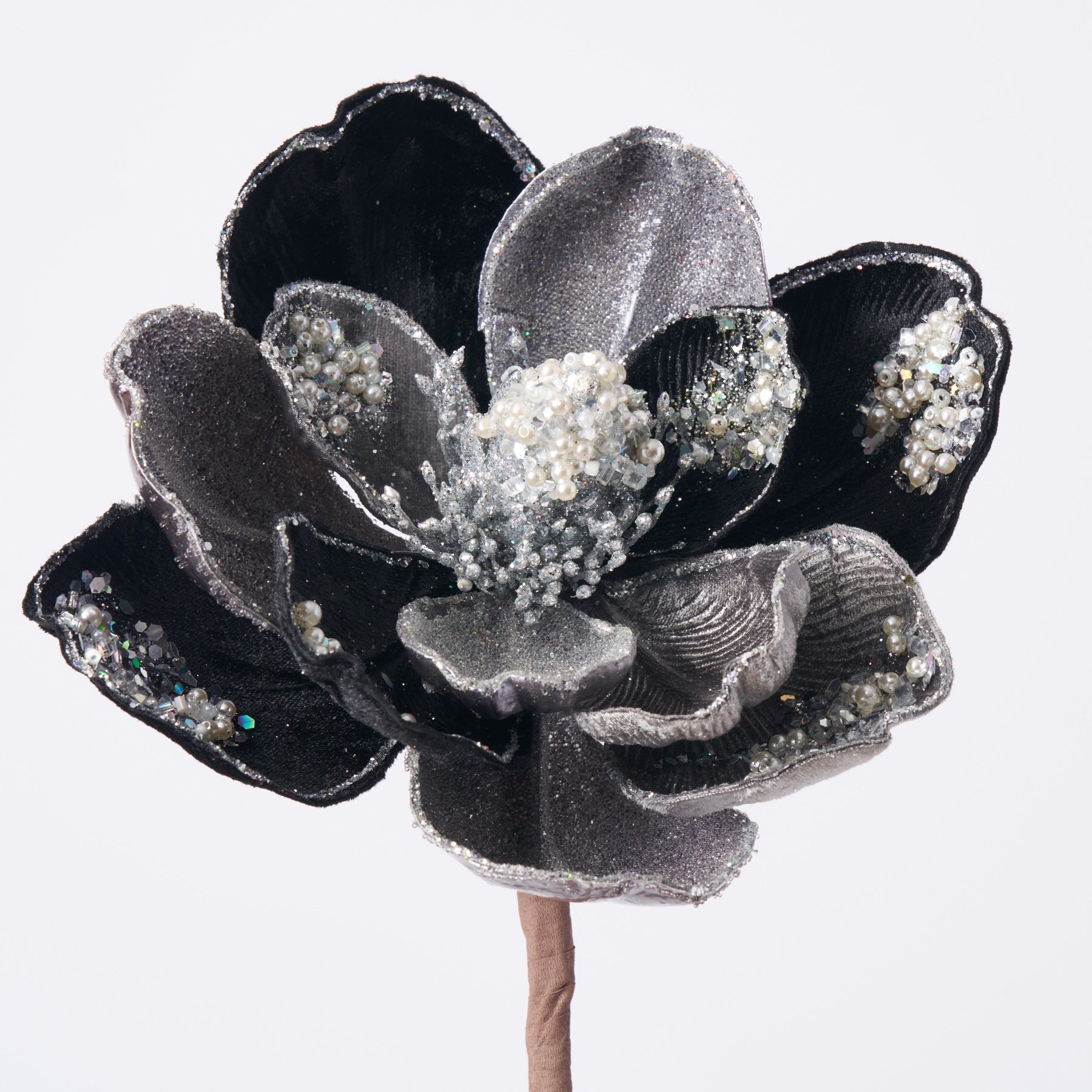 Regular price $34.00This 27-inch faux floral stem features a magnolia bloom richly adorned with black and grey velvet, accented by delicate beading and sequins. Its refined textures and subtle shimmer make it an elegant choice for sophisticated floral arrangements, adding depth and a touch of glamour to any décor setting. Ideal for those seeking a lasting, maintenance-free floral accent with expert-level design appeal. Don't forget to shop our collection of vessels and vases to display your beautiful new flowers in.