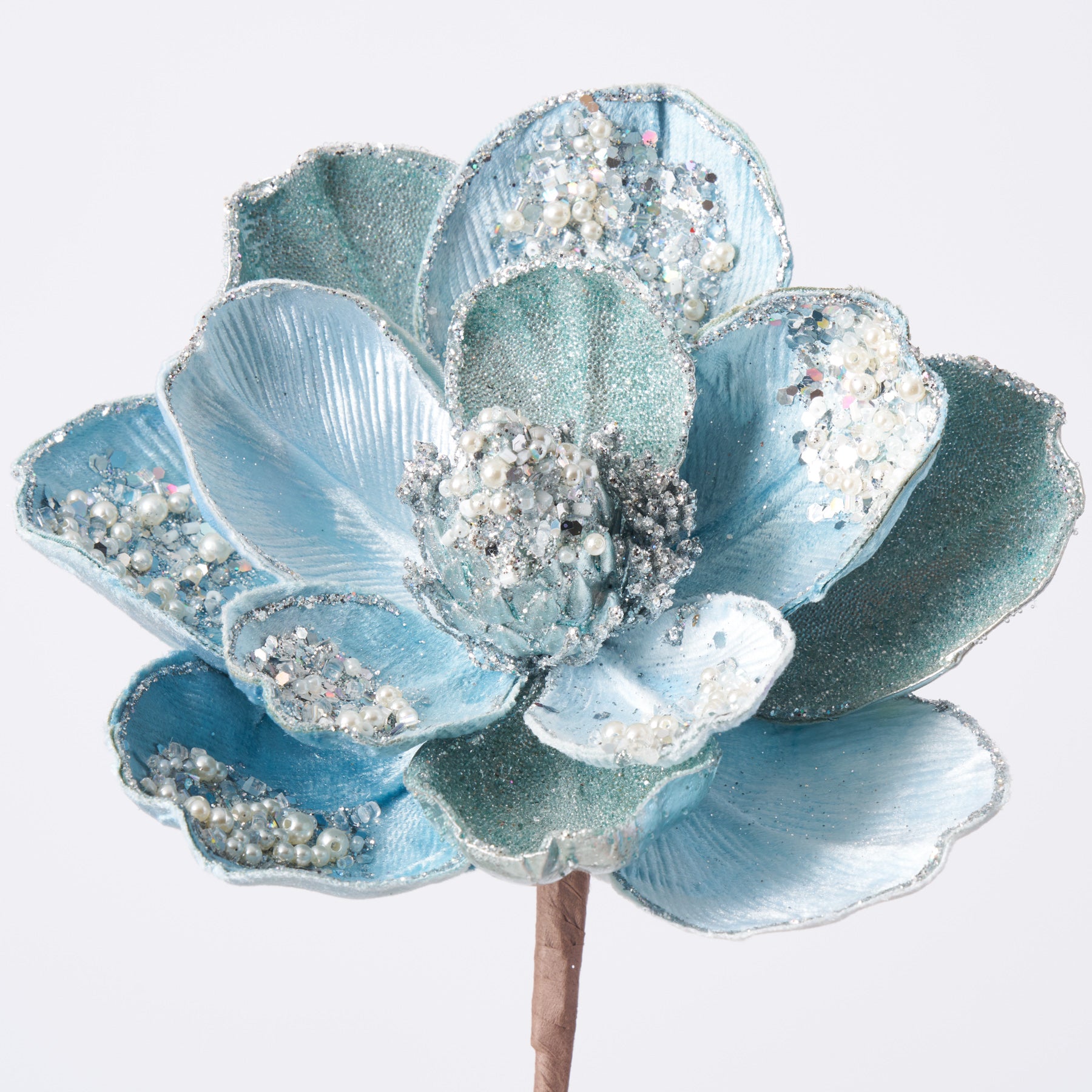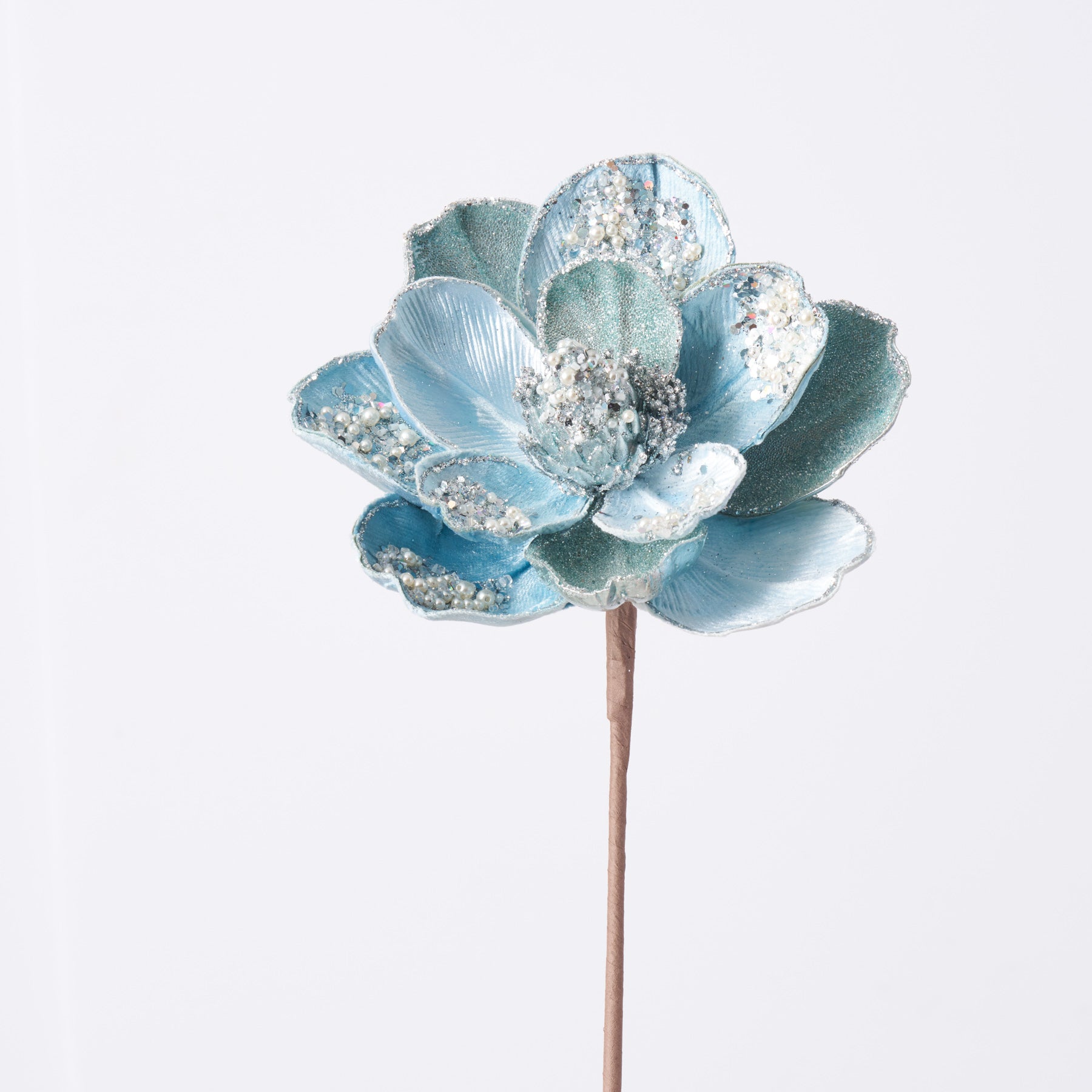 Light Blue Velvet Beaded & Sequined Adorned Magnolia Bloom Faux Floral Stem - 27"