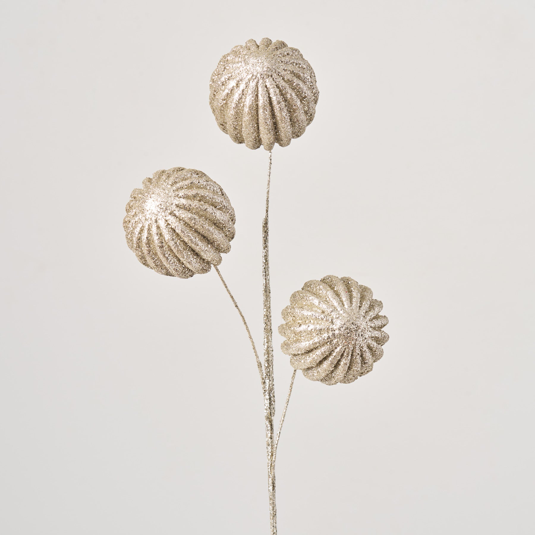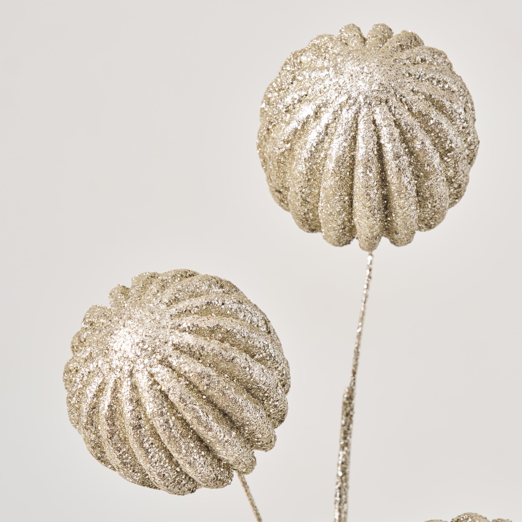 Introduce a touch of opulence to your decor with our Metallic Gold Champagne Glitter Pomegranate Fruit & Leaf Large Branch Spray. Drizzled with glitter, this 45" spray features golden pomegranate fruits and leaves, adding a festive and luxurious touch to any display. Perfect for adding a touch of glamour to your home or event. For an elevated holiday arrangement, showcase a single branch stem alone in your favorite vase. Or, create a timeless and practical display when you purchase more than one stem and feature it in one of Darby Creek Trading's glass containers, vases, or vessels.