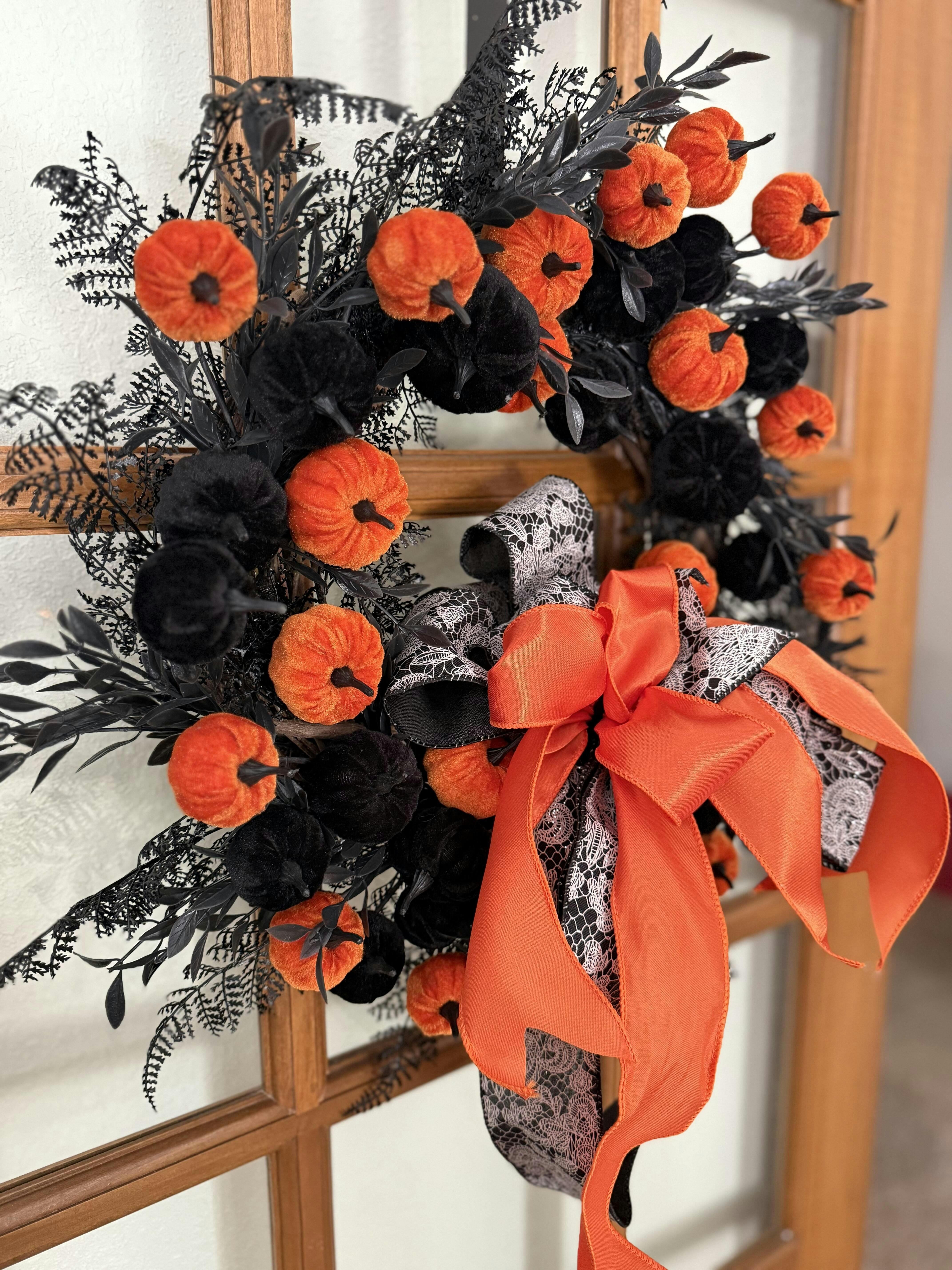 Our Halloween Delight - Black & Orange Mini Velvet Pumpkin with Midnight Foliage Fall Wreath is the perfect statement for your home! Our wreaths also make an excellent gift that can be enjoyed for years to come.