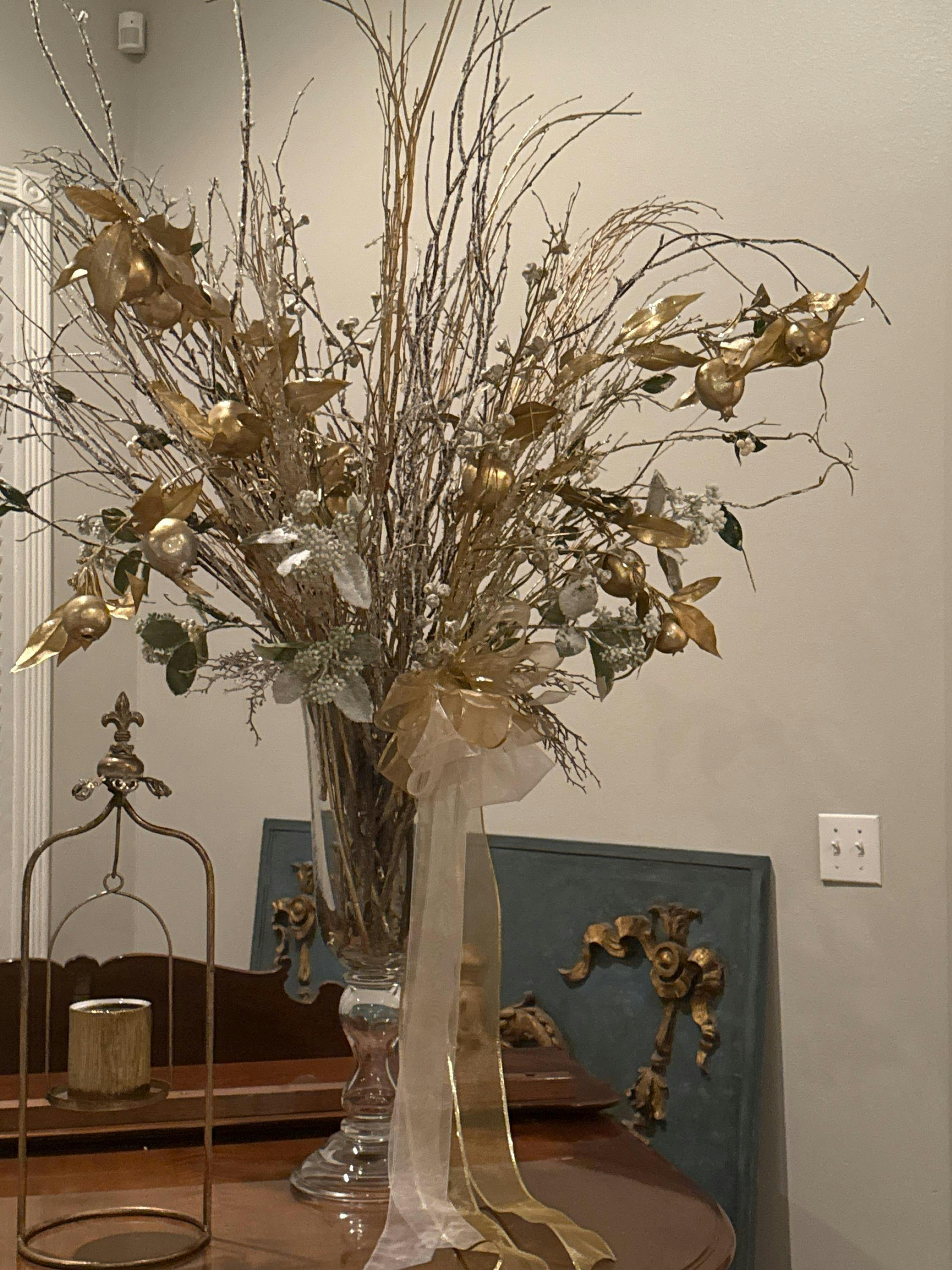 Introduce a touch of opulence to your decor with our Metallic Gold Champagne Glitter Pomegranate Fruit & Leaf Large Branch Spray. Drizzled with glitter, this 45" spray features golden pomegranate fruits and leaves, adding a festive and luxurious touch to any display. Perfect for adding a touch of glamour to your home or event. For an elevated holiday arrangement, showcase a single branch stem alone in your favorite vase. Or, create a timeless and practical display when you purchase more than one stem and feature it in one of Darby Creek Trading's glass containers, vases, or vessels.