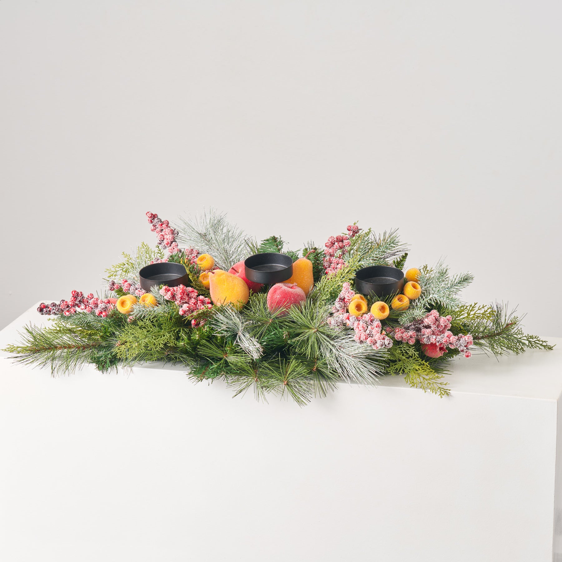 Elevate your holiday décor with this Frosted Fruit 3-Tier Pillar Candle Holder Swag Arrangement. Featuring sugared apples, pears, and crated berries, accented by flocked pine and pinecones, it offers a natural and elegant centerpiece. Designed to complement pillar candles, this table swag brings festive warmth and seasonal charm to your Christmas celebrations with expert craftsmanship and thoughtful detail.