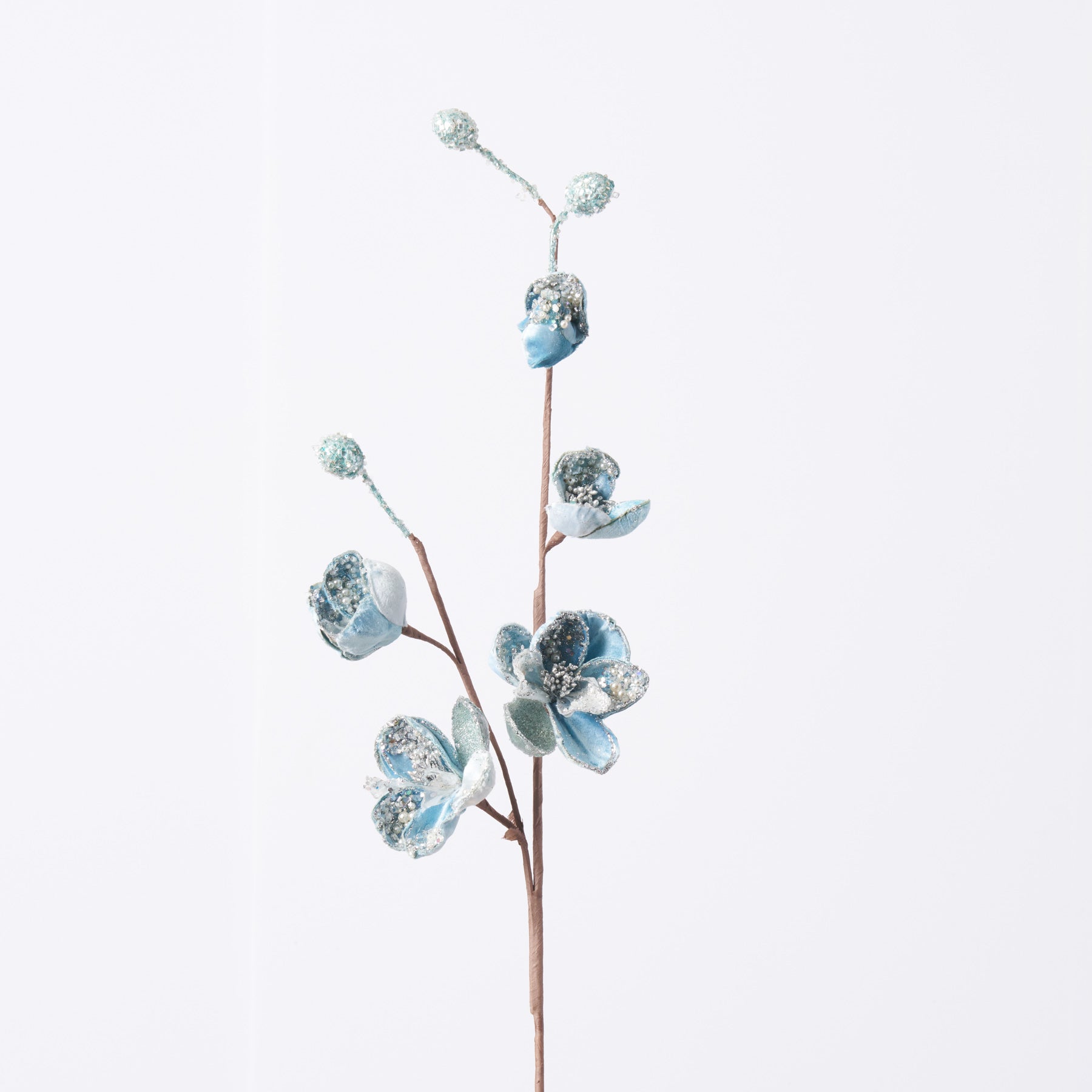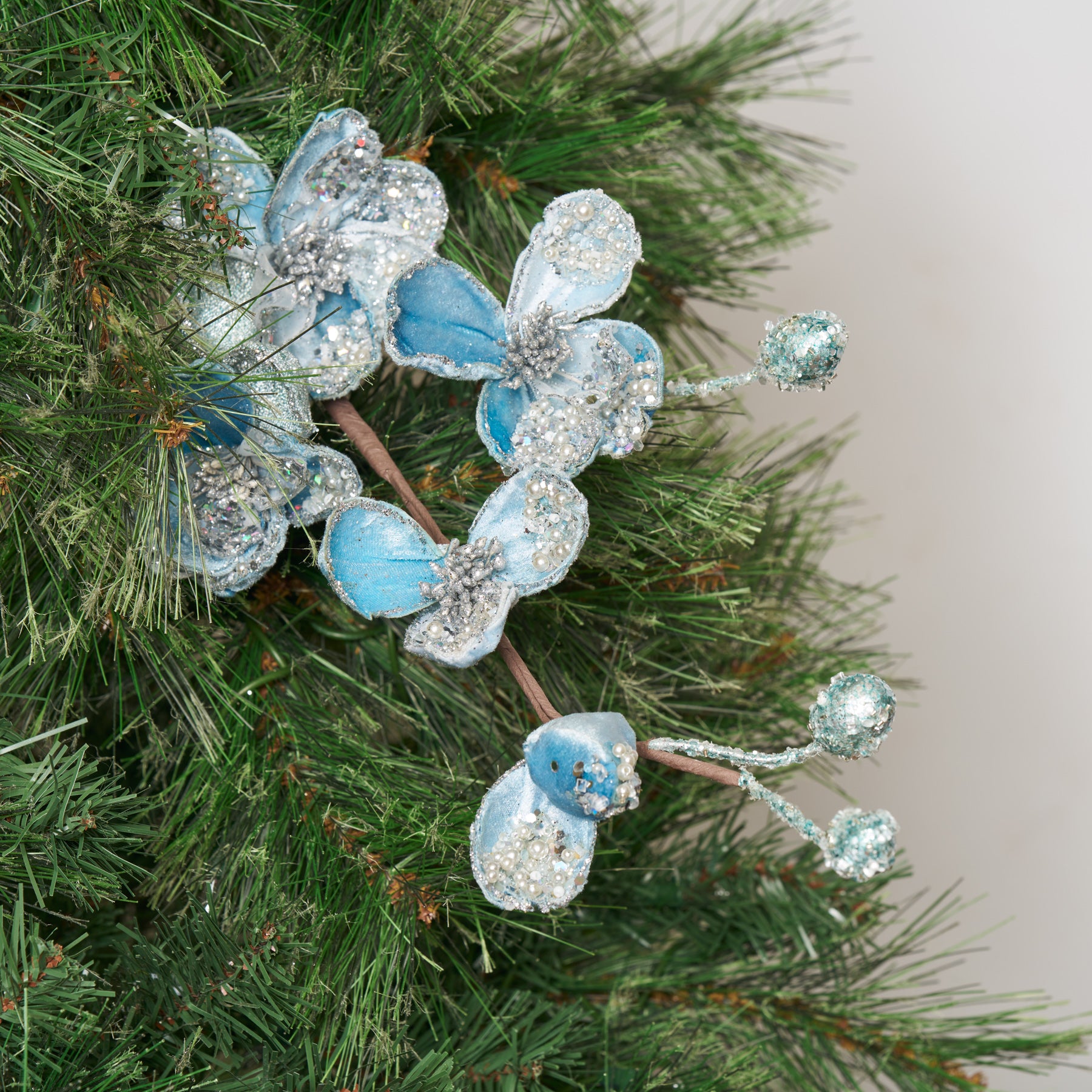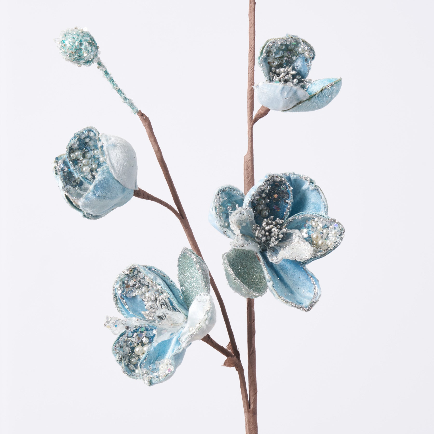 Mini Light Blue Velvet Beaded & Sequined Adorned Magnolia Blooms Faux Floral Stem Spray- 34"